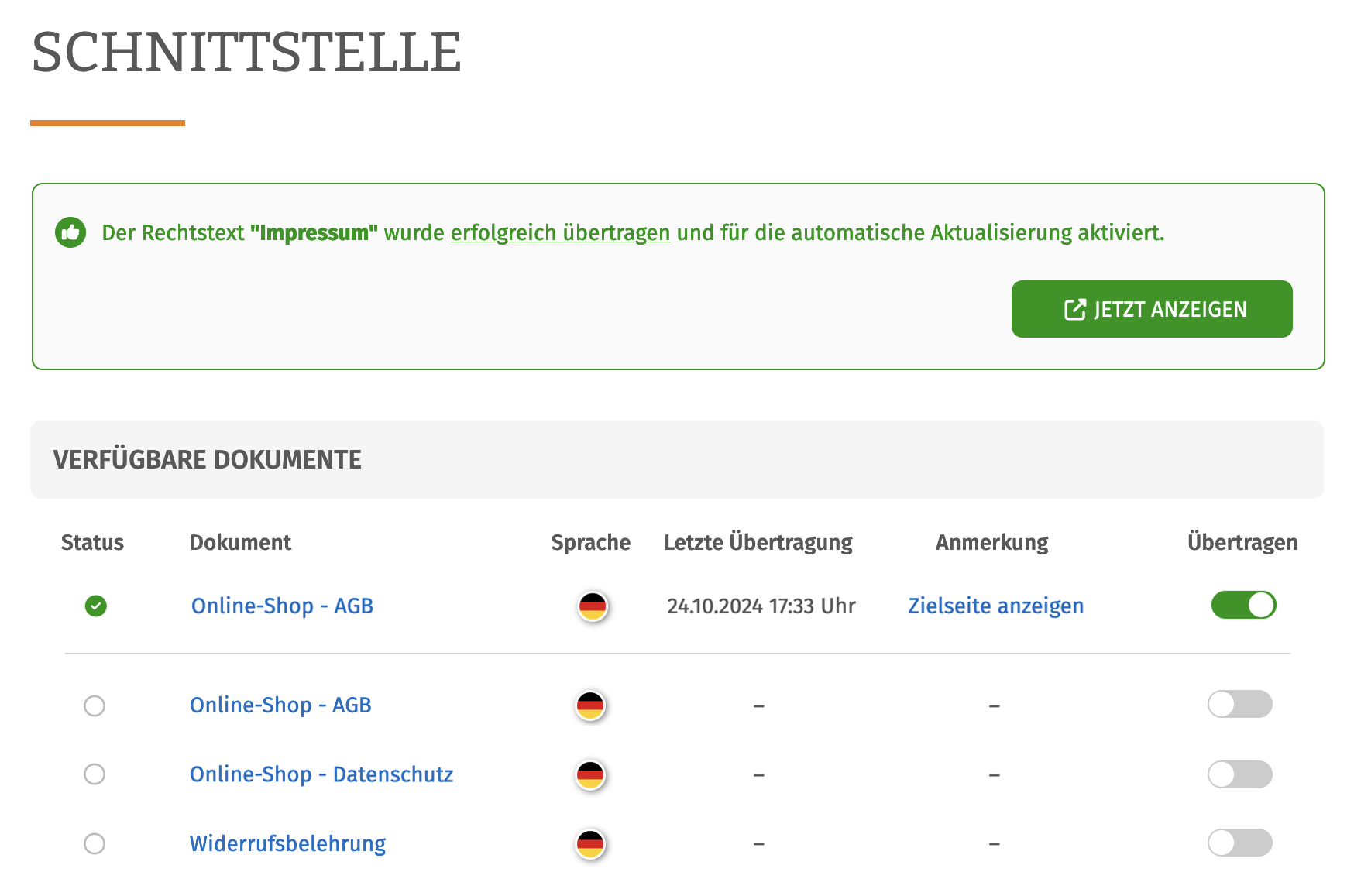Sind die Schieberegler aller zu übertragenden Rechtstexte auf „grün“ gestellt, haben Sie die Schnittstellenübertragung erfolgreich abgeschlossen.